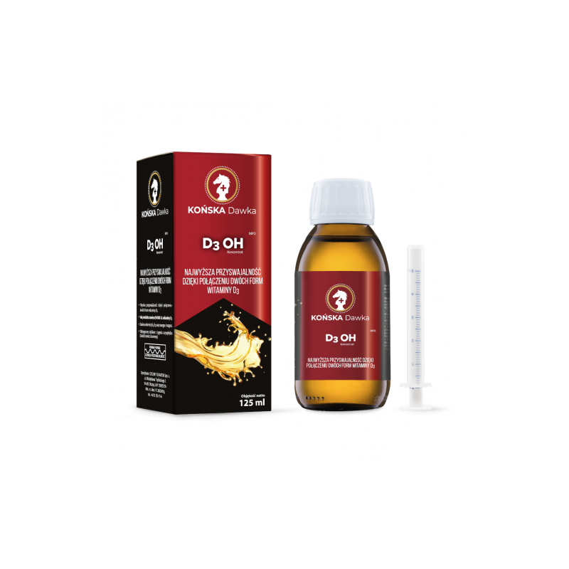 Zawartość: Butelka 125 ml. Skład: 1 ml zawiera 50000 jednostek D3, K2mk7 800 mcg, B3 20mg, B12 40 mcg, Mangan 8mg, Magnez 28 mg. Zastosowanie: Mieszanka uzupełniająca przeznaczona dla wszystkich gatunków zwierząt.