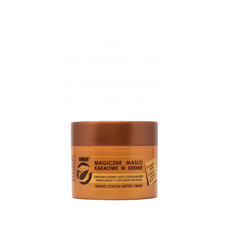 Magiczne Masło Kakaowe w Kremie o pojemności 150 ml to wyjątkowy kosmetyk, który doskonale pielęgnuje skórę, nawilżając ją i łagodząc objawy opalania. Dzięki zawartości składników odżywczych takich jak witaminy E i C, lanolina, olejek ze słodkich migdałów oraz masło kakaowe, ten krem zapewnia kompleksową pielęgnację. Jego formuła przyczynia się także do redukcji zmarszczek i ujędrniania skóry.