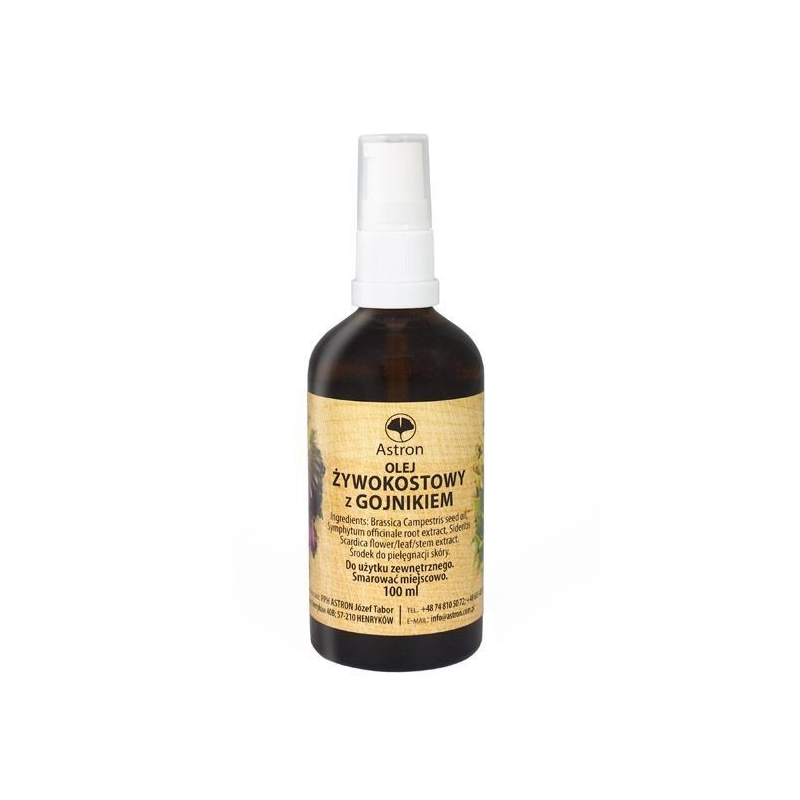 Olejek łączy w sobie unikalne właściwości oleju żywokostowego i oleju z gojnika, które od lat wykorzystywane są w medycynie naturalnej do leczenia różnego rodzaju problemów kostnych i stawowych. Dzięki zawartości substancji aktywnych, takich jak alantoina, garbniki, flawony, witaminy i kwasy fenolowe, produkt skutecznie wspomaga regenerację tkanki kostnej, łagodzi bóle reumatyczne, a także przyczynia się do redukcji stanów zapalnych.