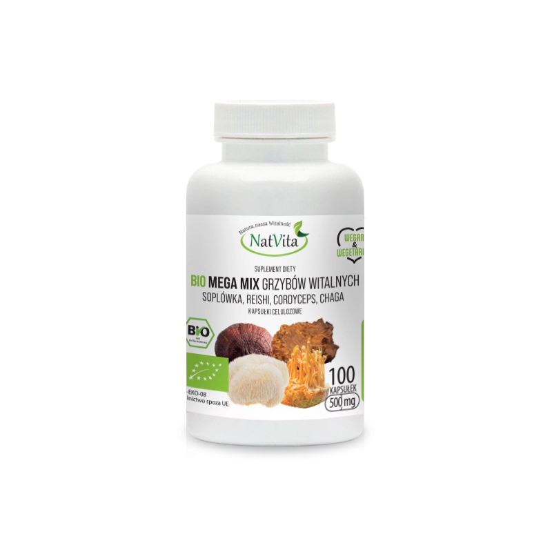 Grzyby witalne Bio Mega Mix - Bio Reishi bogate w polisacharydy i triterpeny, Bio Cordyceps, Bio Chagę oraz Bio Soplówka Jeżowatą (Hericium). Specjalnie skomponowana mieszanka grzybów witalnych o różnych cennych właściwościach i wartościach spożywczych.